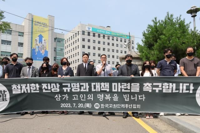 20日,首尔一所小学担任一年级班主任的年轻教师在教室里做出极端选择后,韩国教员团体总联合会会员们在首尔市教育厅前举行记者会,要求尽快查明真相,为尊重教权的正当教育活动改善法律和制度。【图片来源 韩联社】
