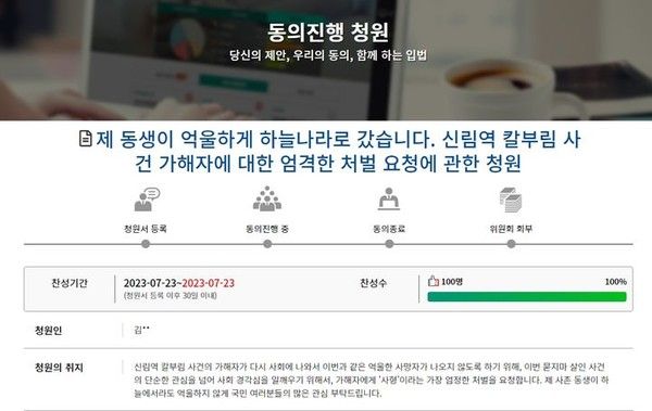 본인을 피해자의 사촌 형이라고 밝힌 김모씨는 지난 23일 국회 국민동의청원 홈페이지에 "신림역 칼부림 사건의 가해자가 다시 사회에 나와서 이번과 같은 억울한 사망자가 나오지 않도록 '사형'이라는 가장 엄중한 처벌을 요청한다"고 적었다.