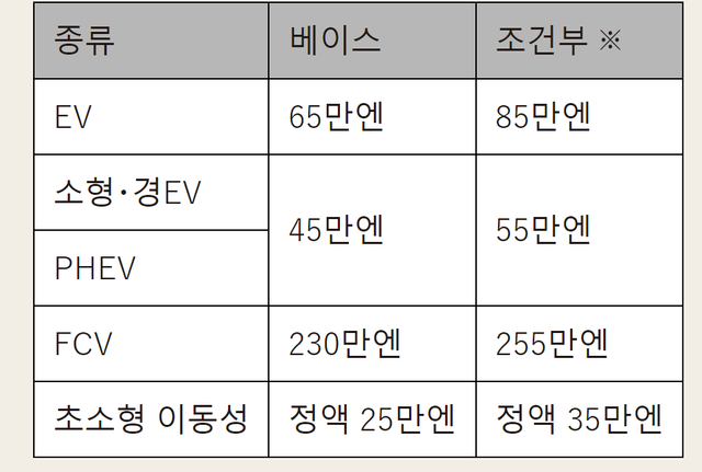 일본 정부는 전기차 보조금 차등 지급을 위해 외부 급속 충전 기능인 V2X 대응 여부와 1500W급 차재 콘센트 장비 구비 여부, 그리고 ‘에너지 절약법 톱 러너 제도’ 대상 차량(형식 지정 자동차) 등 3가지 조건을 내걸고 충족여부에 따라 보조금을 최대 85만 엔(경.소형 전기차는 55만 엔)에서 감액하고 있다.