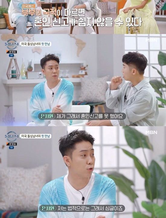 은지원은 사연에 공감하며 "그런 게 힘들다. (미국에서) 혼인신고가 안되더라. 제가 그래서 혼인신고를 못했다. 법적으로 싱글이다"라고 밝혔다.