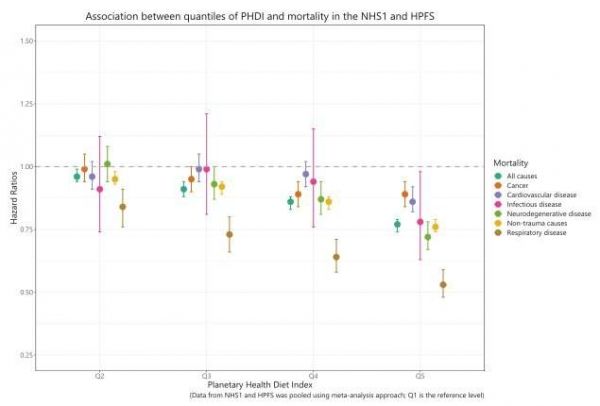 다양한 원인으로 인한 사망 위험과 PHDI(Planetary Health Diet Index) 준수 사이의 관계에 대한 플롯. PHDI가 가장 높은 5분위(Q5)에 속하는 사람들은 가장 낮은 5분위에 있는 사람들에 비해 모든 원인으로 인한 사망 위험이 유의하게 낮았다. /