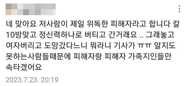 이를 본 네티즌들은 "이미 10방 맞았으면 뭐가 보이겠냐?", "다행히 저 때 이후로 생명의 고비는 넘겼대", "목에 찔리면 진짜 힘든 건데", "목에 찔렸는데 패닉오겠지! 저 정도로 (일어나서 간다고?)라고 이해해야 할 상황을 여친을 버리고 저만 도망가?라고 보다니... 무섭다 정말", "어제도 저 남자가 도망치니 '하남자'라니 뭐니 하는 사람 있던데, 저 남자도 패닉에 빠진 피해자인데 뭐 그리 따지는지 모르겠다" 등 반응을 보였다.