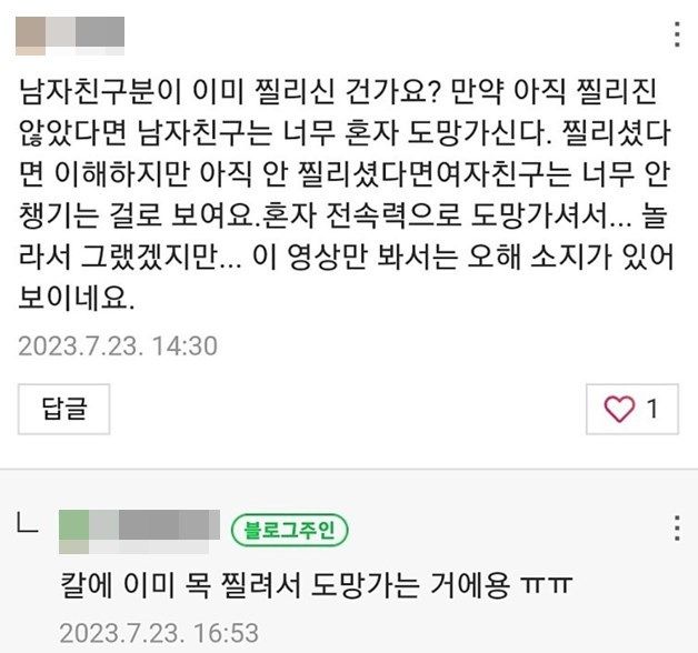 사건의 당사자로 보이는 여성은 자신의 블로그에 글을 올렸다. 이에 한 누리꾼은 "남자친구분이 이미 찔리신 건가요? 만약 아직 찔리진 않았다면 남자친구는 너무 혼자 도망간다. 찔렸다면 이해하지만, 아직 안 찔렸다면 여자친구는 너무 안 챙기는 걸로 보인다. 혼자 전속력으로 도망가서 놀라서 그랬겠지만... 이 영상만 봐서는 오해 소지가 있어 보인다"고 말했다.