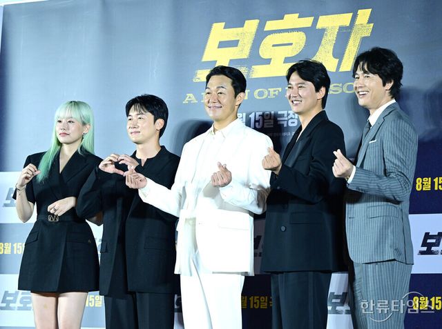 배우 김남길, 박성웅, 김준한, 박유나, 정우성 감독이 24일 오전 서울 용산구 CGV용산아이파크몰에서 열린 영화 '보호자' 제작보고회에 참석해 포토타임을 갖고 있다.