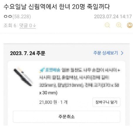A씨는 해당 온라인 커뮤니티에 '수요일날 신림역에서 한녀(한국여성) 20명 죽일 거다'라는 제목의 글을 올리며 온라인 쇼핑몰에서 흉기를 구매한 내역을 첨부했다. 현재 원본 게시물은 삭제됐다.