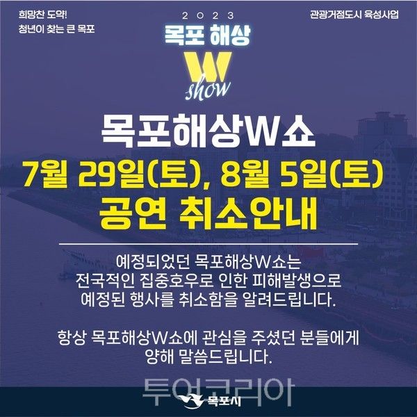 [투어코리아=이주현 기자] 목포시는 목포해상W쇼 개최 예정이었던 7월 29일 정기공연과 8월 5일 특별공연을 취소한다고 밝혔다.