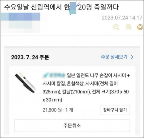 글쓴이는 온라인에서 30㎝가 넘는 흉기를 구매한 내역도 사진으로 첨부했다. 이후 원본 글은 삭제됐으나 여러 온라인 커뮤니티에 해당 글이 공유됐다.