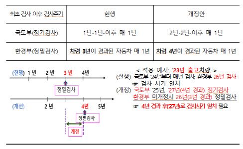 이에 따라 비사업용 경·소형 승합·화물차의 최초 배출가스 정밀검사 시기가 현재 출시 후 차령 3년 경과 후에서 4년 경과 후로 변경된다. 이후엔 이전처럼 매년 1회씩 배출가스 정밀검사를 받으면 된다.