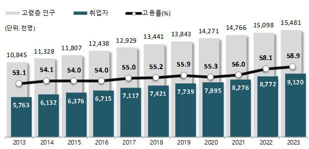 25일 통계청이 발표한 ‘2023년 5월 경제활동인구 고령층 부가조사 결과’에 따르면 고령층 인구는 1548만1000명으로 1년 전보다 38만4000명(2.5%) 증가했다. 10년 전인 2013년(1084만5000명)까지만 해도 1000만명 초반에 그쳤던 고령층 인구는 매해 늘어나 작년 1500만명대를 처음 넘어섰고 올해도 증가 추세를 지속했다. 고령층 경제활동참가율은 60.2%로 전년동월대비 0.8%포인트 올랐다.