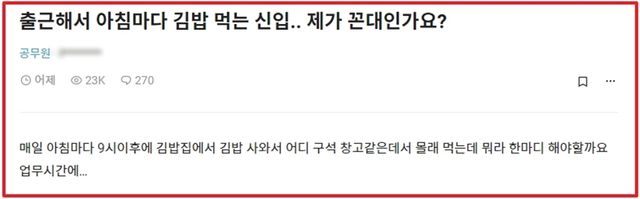 '출근해서 아침마다 김밥 먹는 신입... 제가 꼰대인가요'라는 제목의 글이 최근 직장인 익명 커뮤니티 블라인드에 올라왔다.