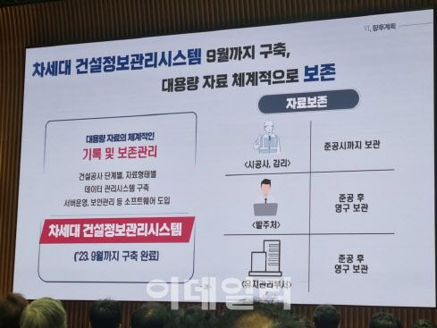 서울시는 건설현장에서 촬영한 방대한 영상 기록물을 체계적으로 보존하기 위해 오는 9월까지 ‘차세대 건설정보관리시스템’을 구축할 계획이다. 대용량 자료의 체계적인 기록 및 보존 관리를 위해 건설공사 단계별, 자료형태별 데이터 관리시스템을 구축해 서버를 운영하고 보안관리 등 소프트웨어를 도입할 예정이다. 자료 보존은 시공사와 감리는 준공시까지, 발주처와 유지관리부서는 준공 이후 영구 보관하도록 한다.