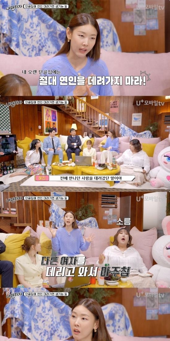 오는 26일 U+(유플러스) 모바일TV에서 공개되는 예능 프로그램 '믿고 말해보는 편-내편하자'(이하 '내편하자')에서는 한혜진, 풍자, 엄지윤, 랄랄이 게스트 곽범, 권혁수와 함께 연인 '상도덕'에 대해 이야기를 나눈다.
