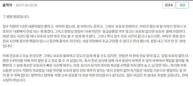 이어 그는 "(직원이 보호자에게) '원장님 방침이 14세 미만은 응급상황일 경우에만 보호자 없이 진찰한다. 30분 정도 시간 드릴 테니 보호자로 오시면 바로 진료 볼 수 있게 해주겠다', '그러나 늦으시면 현장 접수 진료 시간에 접수한 아이들이 있으니 다른 환아에게 미안해서 (바로 진료를 보기엔) 조금 곤란할 수 있다고 안내했다'고 설명했다.