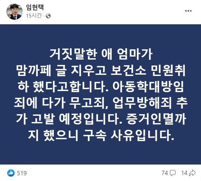 지난 25일 임현택 회장은 페이스북에 "거짓말한 애 엄마가 맘카페 글 지우고 보건소 민원 취하했다고 한다"며 "아동학대 방임죄에다가 무고죄, 업무방해죄 추가 고발 예정"이라고 강조했다.
