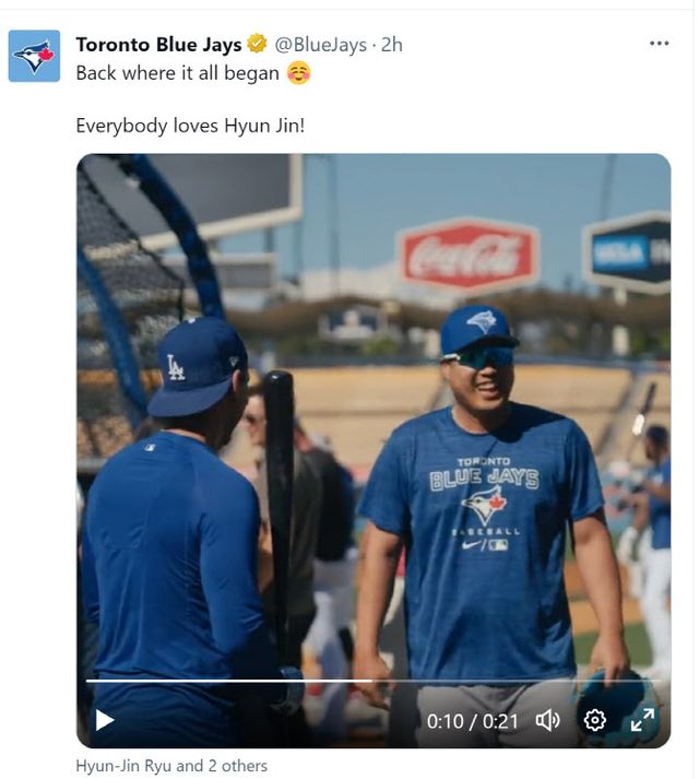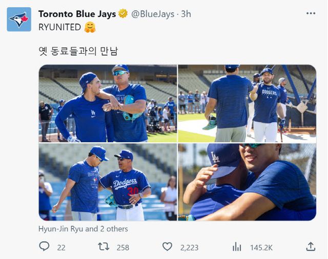 미국프로야구 메이저리그(MLB) 토론토 블루제이스 구단은 26일(한국시간) SNS를 통해 다저스 선수단과 만난 류현진의 모습을 소개했다.