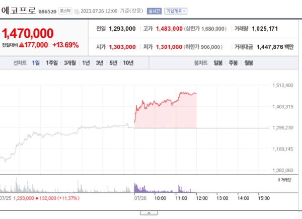 26일 한국거래소에 따르면 에코프로는 이날 정오 기준 전거래일대비 13.69%(17만7000원) 상승한 147만 원에 거래됐다. 장중 고가 148만 3000원, 저가 130만 1000원을 기록 중이다.