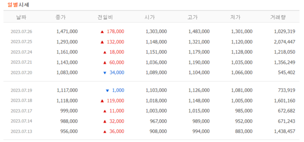 에코프로 주가는 에코프프로비엠과 함께 이차전치 투자 열풍에 대한 시장의 기대감 등의 영향으로 연일 급등하고 있다.