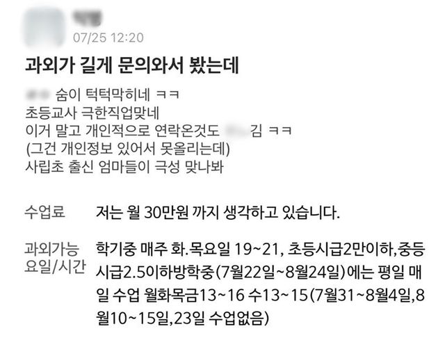 그러면서 A씨는 학부모로부터 받은 요구사항을 공개했다. 학부모는 "수업료는 월 30만 원까지 생각하고 있다. 초등학생 시급은 2만 원 이하, 중학생 시급은 2만 5000원 이하"라고 밝히며 과외 가능 시간도 구체적으로 적었다.
