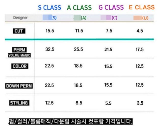 게시글에는 강남에 위치한 미용실의 커트 가격표가 담겼다. 가격표에 따르면 S CLASS 디자이너에게 커트를 받을 경우 15만 5000원이다. 이후 등급별로 11만 5000원, 7만 5000원, 4만 5000원이다. 펌이나 염색, 클리닉 등이 포함되지 않은 오로지 커트만 했을 때의 비용이다.