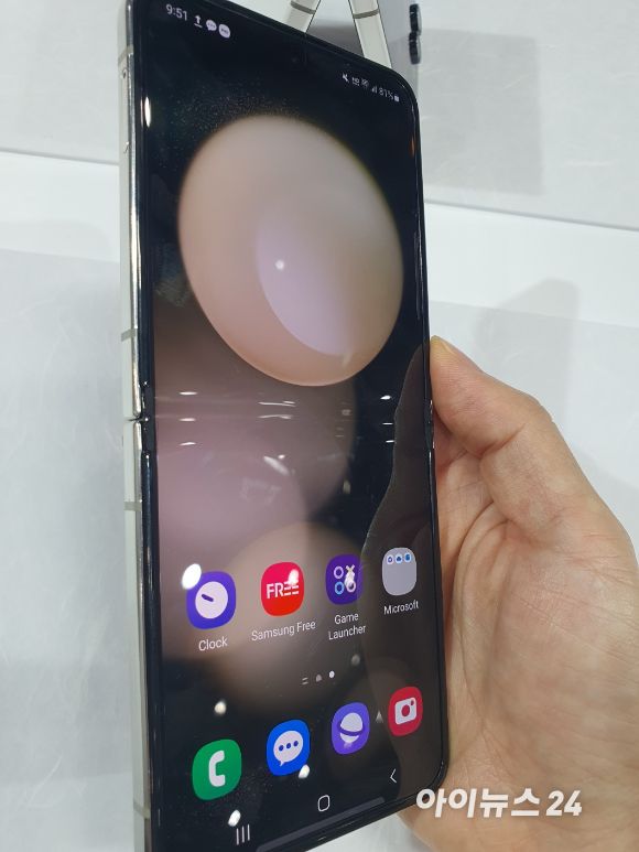 하지만 26일 첫 한국 언팩이 열린 서울 코엑스에서 '갤럭시 언팩'이 끝난 직후 마주한 '갤럭시Z플립5'의 실제 모습은 이런 생각들을 와장창 깨뜨렸다. 제품을 보자마자 처음 든 생각은 "디자인 왜 이렇게 예쁘지? 나도 이번에 바꿀까"였다. 아무래도 '갤럭시 언팩' 현장에서 걸그룹 아이브 멤버인 장원영이 미국 유명 배우 시드니 스위니와 함께 '갤럭시Z플립5'로 셀카를 찍은 게 한 몫 한 것 같단 생각도 들었다.