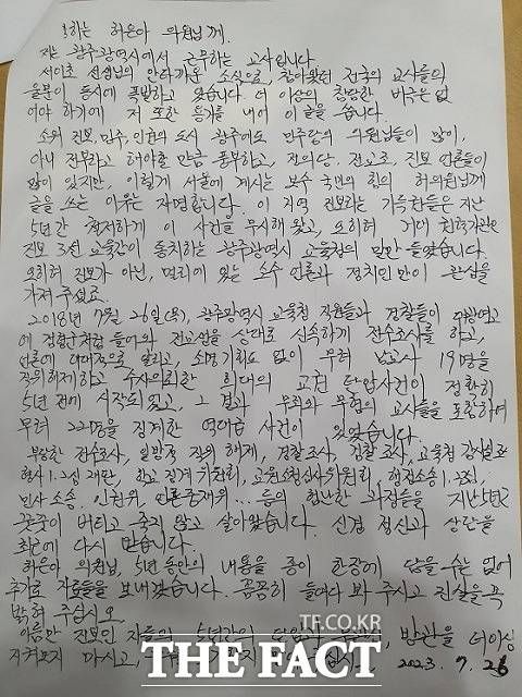 이어 그는 "선생님은 2018년 7월, 학생 대상 설문조사를 통해 느닷없이 스쿨미투의 대상이 되셨다"라며 "소명의 기회도 얻지 못하고 일방적인 분리 조치와 직위해제가 이어졌지만, 지난한 시간 끝에 1심, 2심, 대법 행정소송 모두 승소, 급여 반환을 위한 민사 소송에서도 승소했다"고 설명했다.