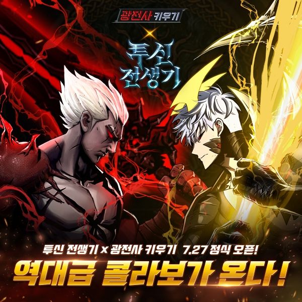 글로벌 캐주얼 게임 개발사 쿡앱스(대표 박성민)는 오늘 자사가 개발하고 서비스하는 방치형 액션 RPG ‘광전사 키우기’에서 네이버 웹툰의 인기 작품 '투신전생기'와의 콜라보레이션을 진행한다고 발표했습니다. 이 콜라보레이션은 2023년 7월 27일부터 8월 25일까지 진행될 예정입니다.