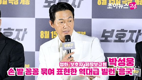 [조이뉴스24 문수지 기자] 배우 박성웅이 지난 24일 오전 서울 CGV용산아이파크몰점에서 열린 영화 '보호자'(감독 정우성) 제작보고회에 참석해 소감을 말하고 있다.