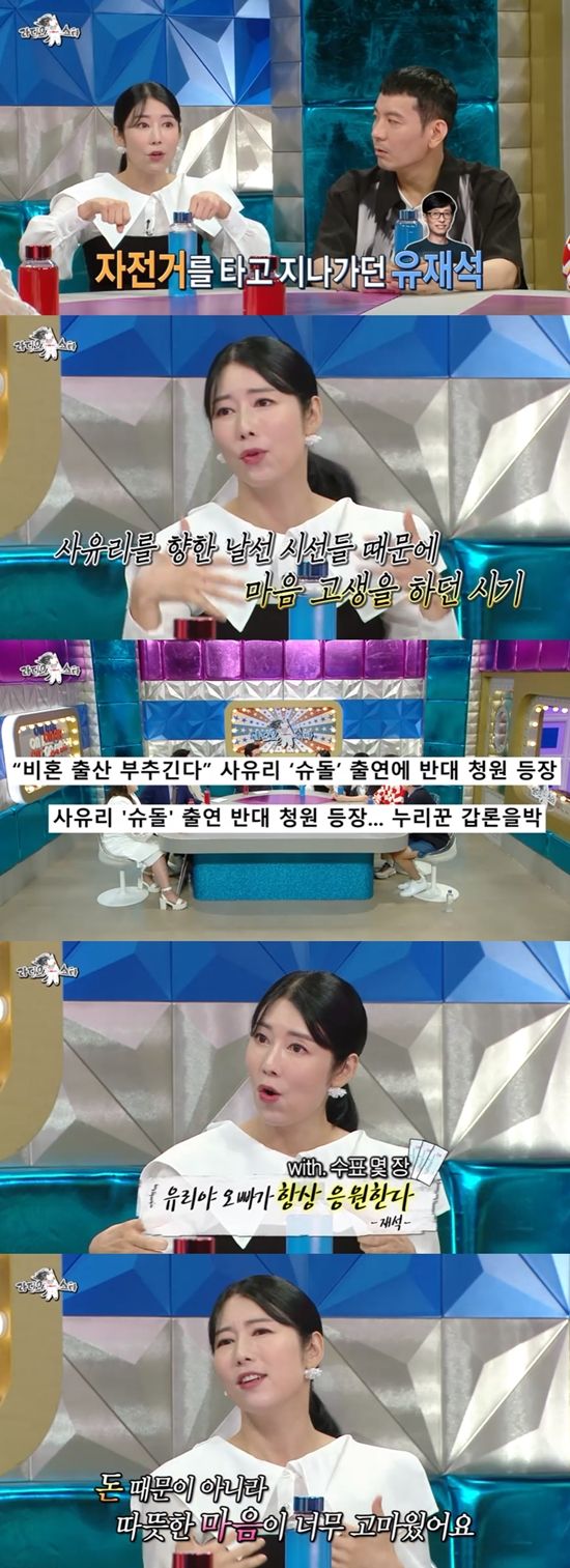이와 더불어 사유리는 유재석의 미담을 전했다. 그는 "이지혜 씨랑 같이 공원에 있었는데 유재석 씨가 자전거를 타고 지나가더라. 방송에서 마주친 적이 많지 않아서 연예인 본 것처럼 신기했다"며 "당시 젠이 4개월 됐을 때였는데, 한창 방송 출연 반대 청원도 있었던 시기라 마음이 좋지 않았다"고 말했다. 사유리는 일본에서 정자를 기증받아 지난 2020년 11월 아들 젠을 출산했다.