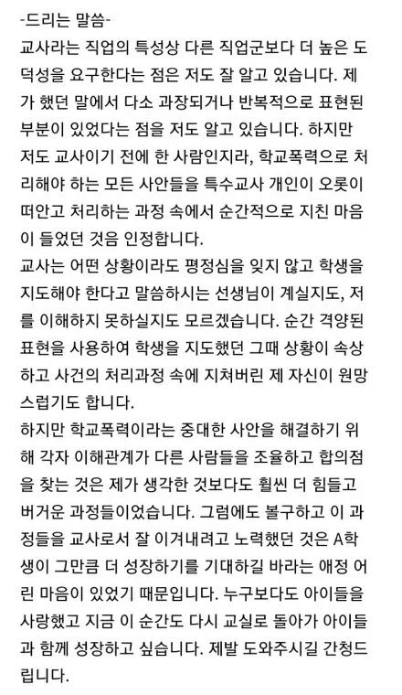 끝으로 “학생에게 한 말들은 ‘너 교실에 못 가. 친구들 얼굴도 못 봐. 왜 못 가는지 알아?’ 등의 표현이었다. 교실로 가려는 학생을 말리면서 반복적으로 학생에게 단호한 어조로 말한 사실은 있으나 이는 B학생을 학대하려는 의도가 아니라 어떻게든 학생의 교출을 막아 학교 폭력으로 인한 2차 피해를 막고 싶어서 한 행동이었음을 말씀드리고 싶다”라고 덧붙였다.
