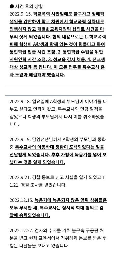 해당 내용에서 특수교사 A씨는 “통합학급 수업 도중 B학생은 갑자기 여학생 앞에서 바지를 내리는 행동을 했고, 여학생은 큰 충격을 받아 등교를 거부하며 학교폭력 사안으로 접수가 됐다”며 “학교폭력(성폭력) 사안이었지만, 피해 여학생 학부모가 강제전학, 분리조치를 원했는데 해당 조치는 현실적으로 어려운 부분이 있어 통합시간을 최대한으로 줄여달라고 피해 여학생 학부모가 요청했다”고 밝혔다.