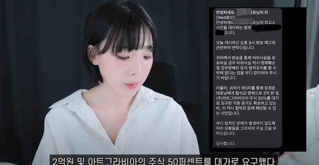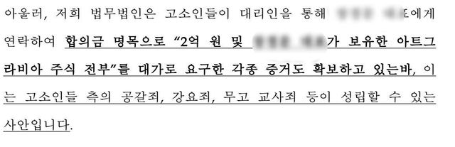 이어서 법인 측은 “고소인들이 대리인을 통해 J 대표에게 합의금 명목으로 2억 원 및 ‘아트그라비아’ 주식 전부를 대가로 요구한 각종 증거를 확보했다. 이는 고소인들 측의 공갈죄, 강요죄, 무고 교사죄 등이 성립할 수 있는 사안이다”라며 고소인들이 합의금을 요구했다고 주장했다.