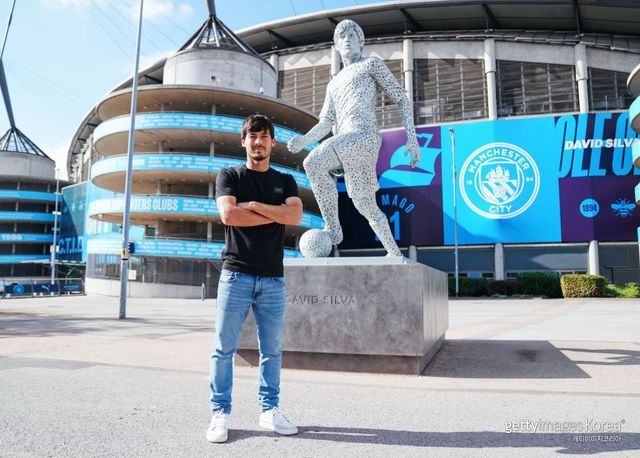 맨체스터 시티 홈구장 에티하드 스타디움 밖에 세워진 자신의 조형물 앞에서 포즈를 취한 실바. 사진=게티이미지코리아.