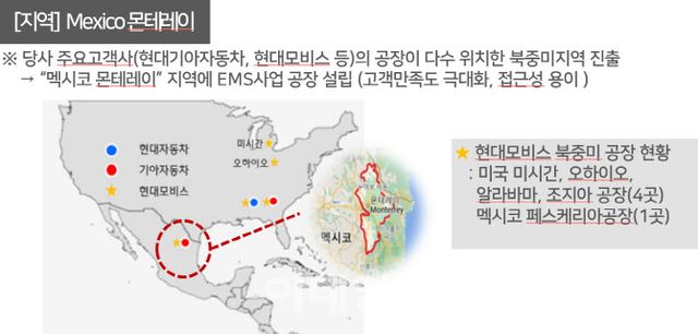 몬테레이 공장은 전체 부지 9만9100여㎡(옛 3만평) 땅에 4만9500㎡(옛 1만5000평) 규모로 지어지며, 2025년 3월부터 총 1350만대 분의 CCU(차량유무선통신통합제어기)·DCU(데이터통신통합관리장치)·BDC(편의기능종합제어기인 바디제어장치)를 생산한다.