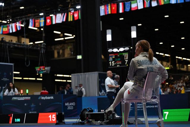 27일(현지시간) 이탈리아 밀라노에서 열린 2023 펜싱 세계선수권 여자 사브르 64강전에서 우크라이나의 올하 하를란이 러시아 출신인 안나 스미르노바를 15-7로 이긴 후 악수를 하지 않았다.