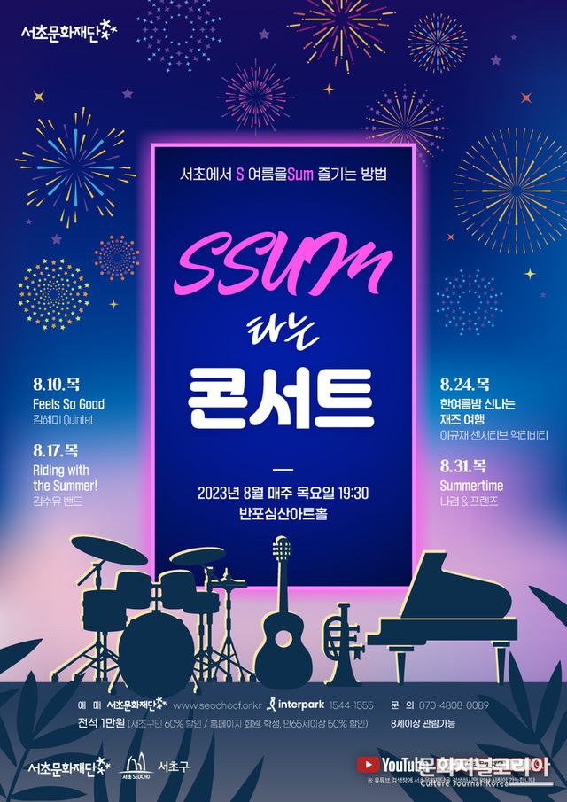 문화저널코리아 김영일 기자 | 서초문화재단(대표이사 강은경)은 팝, 재즈, OST 곡들로 구성된 <SSUM 타는 콘서트>를 개최한다고 밝혔다. <SSUM 타는 콘서트>는 서초에서(S) 여름을(SUM) 즐길 수 있는 이색적인 썸머 콘서트이다.