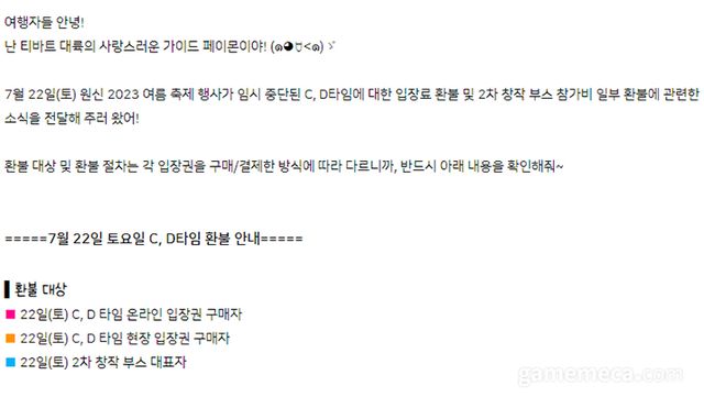 ▲ 원신 여름축제 22일 입장권 및 부스 신청비 환불 공지 (자료출처: 원신 공식 카페)