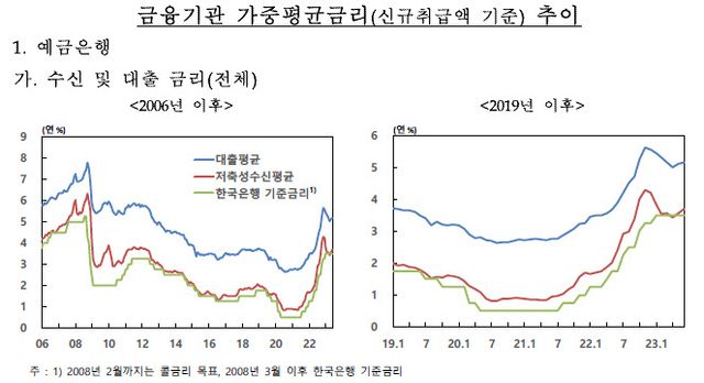 예금은행의 수신금리는 0.13%포인트 상승한 3.69%로 집계됐다. 두 달 연속 상승세다. 정기예금은 3.65%로 0.15%포인트 올랐다. 금융채 등 시장형금융상품은 0.12%포인트 상승한 3.83%를 보였다.
