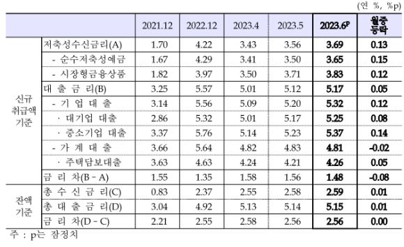 예대금리차는 수신금리가 대출금리보다 크게 상승하면서 4개월 연속 축소(1.56%p → 1.48%p)했다. 다만 잔액 기준 예대금리차는 전월 수준을 유지했다.