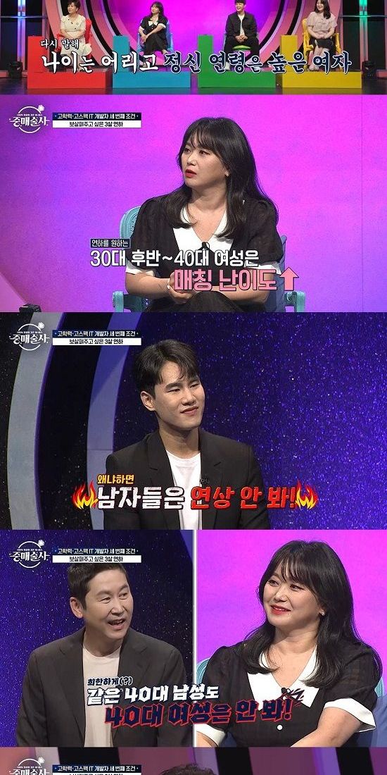 한편 MC 신동엽의 “여성 회원들도 연하를 원하는 경우가 있는지?”에 대한 질문에 김은주 블루 중매술사는 “연하를 원하는 30대 후반~40대 여성은 매칭 난이도가 높은데 남자들이 연상을 보지 않기 때문”이라며 “40대 남성도 40대 여성은 안 본다”라고 중매 시장의 힘든 현실을 밝혔다.