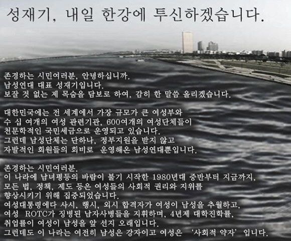 성 대표는 26일 자신의 트위터에 “이제 나는 한강으로 투신하려 한다. 남성연대에게 마지막으로 기회를 달라. 뻔뻔스러운 간청이지만 시민 여러분이 십시일반으로 1억 원을 빌려 달라”면서 투신을 예고했다. 이후 그는 “정말 부끄럽다. 죄송합니다. 평생 반성하겠습니다”라는 글과 함께 한강 다리 위에서 뛰어 내리는 사진을 공개하며 이날 오후 3시 20분께 마포대교에서 투신했다.