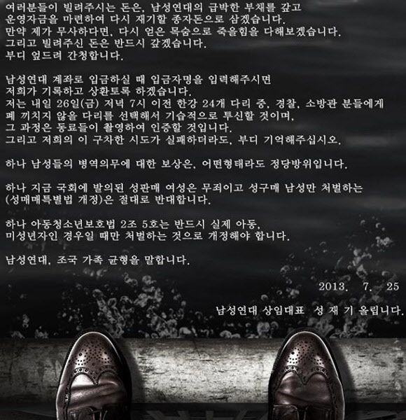 투신은 하루 전부터 예고됐다. 남성연대 부채 상환과 운영 자금 조달이 목적이었다. 25일 남성연대 홈페이지에는 “목숨을 걸고 시민 여러분께 호소하려 한다. 남성연대에게 마지막 기회를 달라. 이제 한강으로 투신하려 한다”며 “부채 해결을 위해 1억 원만 빌려달라. 빌려주시는 돈은 남성연대의 급박한 부채를 갚고 운영 자금을 마련하여 다시 재기할 종잣돈으로 삼겠다. 빌려주신 돈은 반드시 갚겠다”는 장문의 공지가 올라왔다.