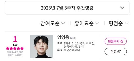 아이돌차트에 따르면 지난 7월 21일부터 7월 27일까지 집계된 7월 3주 차 평점랭킹에서 임영웅은 45만 1680표를 얻어 최다득표를 기록했다.