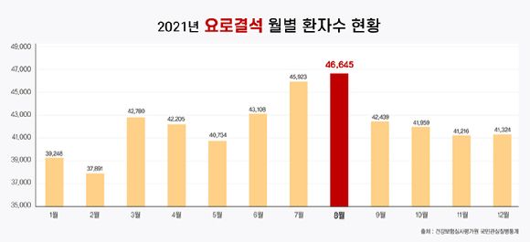 요로결석은 기온이 높은 여름철에 환자가 가장 많다. 건강보험심사평가원 국민관심질병통계의 2021년 월별 요로결석증 진료 인원을 보면 8월에 4만6천645명으로 연중 환자 수가 가장 많았다.