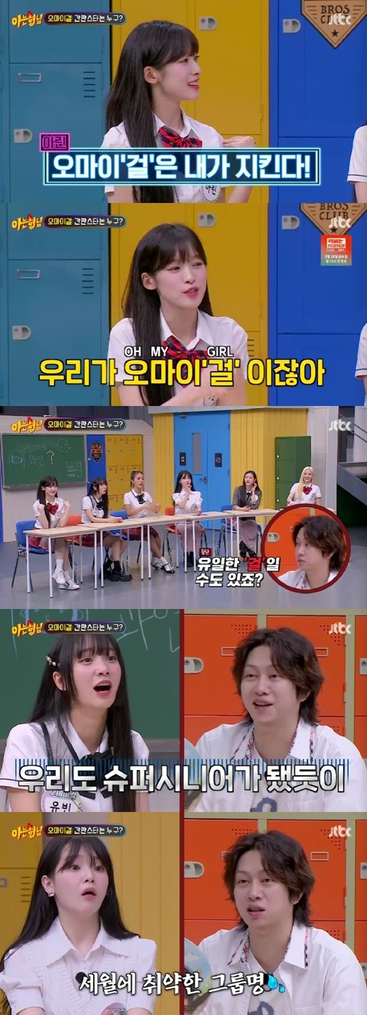 29일 방송한 JTBC 예능프로그램 ‘아는 형님’에는 미니 9집 ‘Golden Hourglass(골든 아워글래스)’ 타이틀곡 ‘여름이 들려(Summer Comes)’로 컴백한 오마이걸이 출연했다.