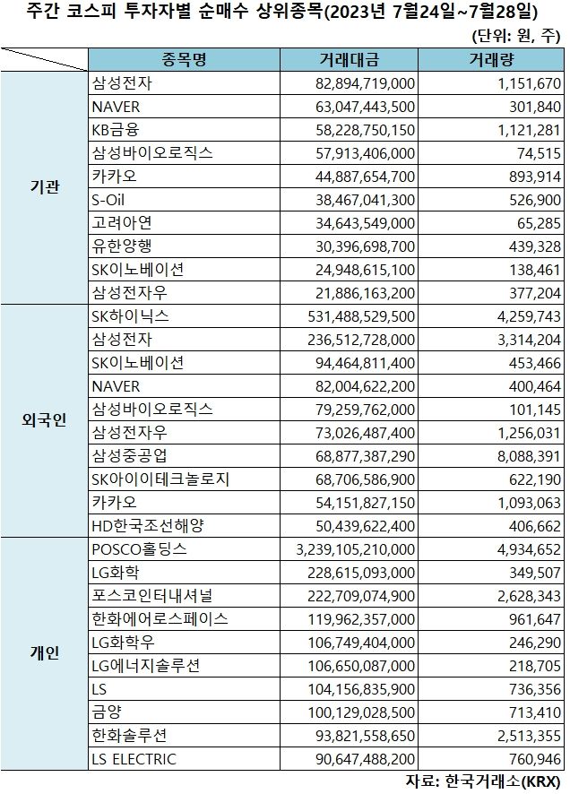 [표] 주간 코스피 기관·외인·개인 순매수 상위종목(7월24일~7월28일)