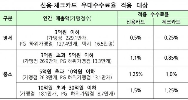 하반기에 우대수수료가 적용된 연매출 30억원 이하의 신용카드 가맹점은 300만4000개며 PG 하위가맹점은 162만6000개, 개인택시사업자는 16만5000명에 해당된다. 연매출 3억원 이하의 영세 가맹점은 신용카드 가맹점이 229만개, PG 하위가맹점은 127만4000개, 개인택시사업자 16만5000명으로 신용카드 수수료 0.5%, 체크카드 0.25% 우대 혜택을 받는다.