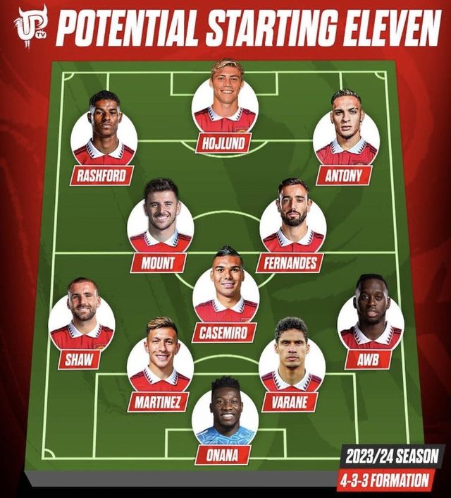 한 팬은 SNS을 통해 '2023/24시즌 맨유 선발 베스트 11 예상'이라며 라인업을 게시했다. 4-3-3 전형인 새 라인업에서 새로운 수호신 오나나가 골문을 지키고, 주전 백4는 루크 쇼, 리산드로 마르티네스, 라파엘 바란, 애런 완-비사카로 지난 시즌과 동일했다.