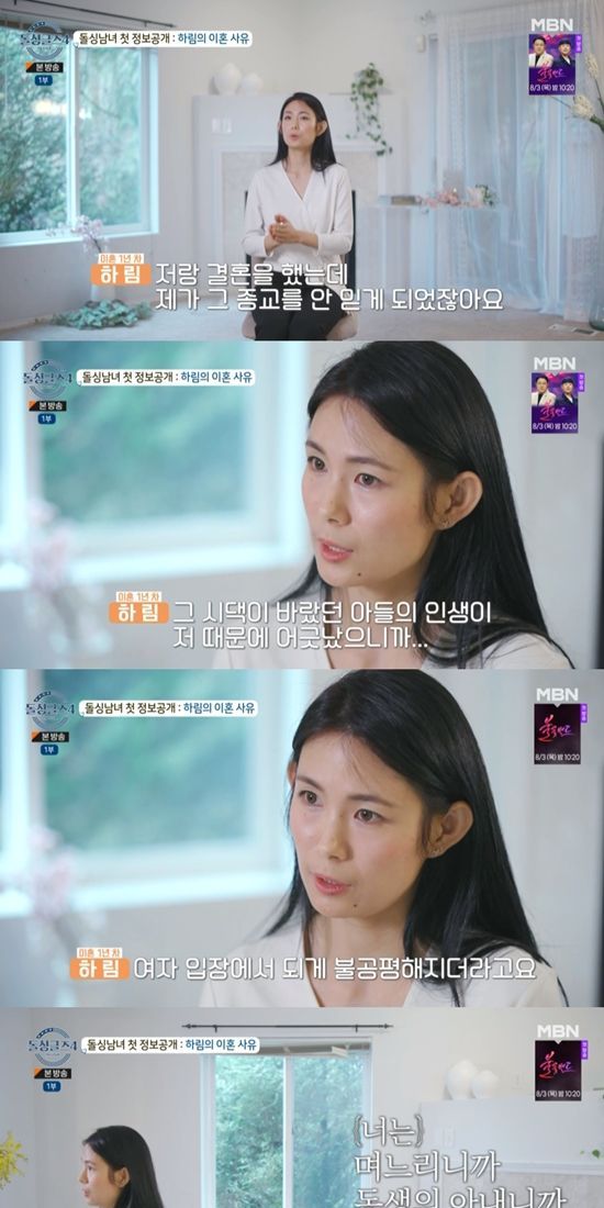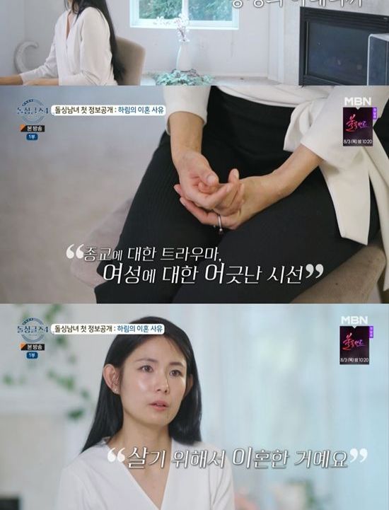 하림은 "나는 그 종교에 대해서 잘 모르고 결혼했다. 전남편은 그 종교를 나왔지만, 그 가족이 다 그 종교다. 결혼을 하고 나니까 내 인생이 그 종교 안에서 완전히 제한되더라. 나는 되게 자유로운 사람인데 낯선 이들이 내 인생을 컨트롤해 버리니까 굉장히 큰 압박감을 느꼈다"고 말했다.