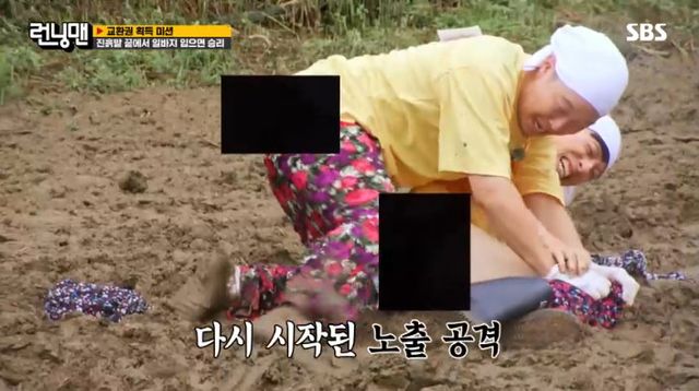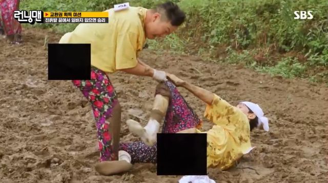 유재석과 하하는 시작부터 서로의 일바지를 훌렁 벗기며 거친 몸싸움을 펼쳤다. 육탄전이 노출로 이어지자 제작진은 큼지막한 검은색 모자이크로 황급히 가렸다. ‘런닝맨’은 지난 2018년 8월 이광수가 김종국의 바지를 벗기고 속옷이 노출되는 장면에 노골적인 자막을 더했다가 방송통신심의위원회로부터 법정제재인 ‘주의’를 받은 바 있다.