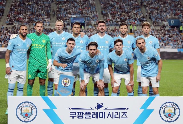 지난 30일 서울 마포구 서울월드컵경기장에서 열린 쿠팡플레이 시리즈 2차전 아틀레티코 마드리드와 맨체스터 시티 FC의 경기에 나선 맨시티 엘링 홀란드와 잭 그릴리쉬 등 선발 선수들이 포즈를 취하고 있다. / 뉴스1